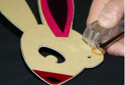 まず、色を付ける部分に接着剤(又はのり)を付けます。その後、色セロファン等のカラーフィルターを貼り、色がはみ出ないようにのりしろ部分からなぞるようにして切り抜きます。