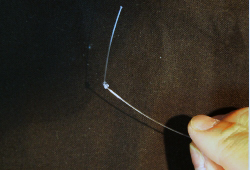ホッチキスで留めますが、テグスが滑りでないように先端を結んでおきます。