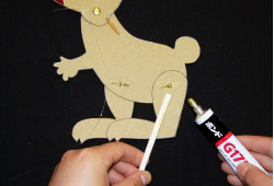 足の部分に割り箸などの長い棒をボンドで貼り割りピンで胴体と付けるとほぼ完成。